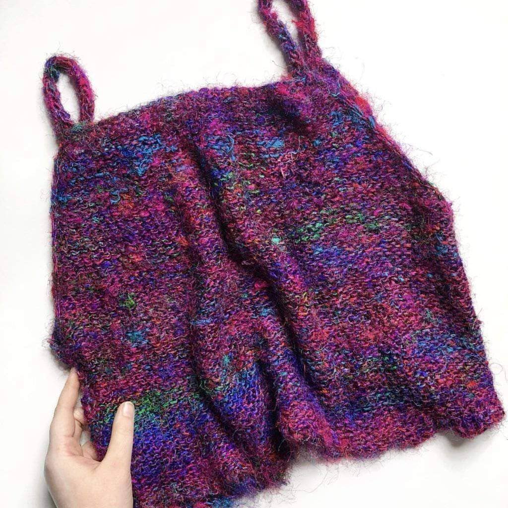 Make a fun, breezy crop top with one of the first fibers we ever sold: our Premium Sari Silk Handspun Yarn! This easy knit pattern is available in Small to X-Large.