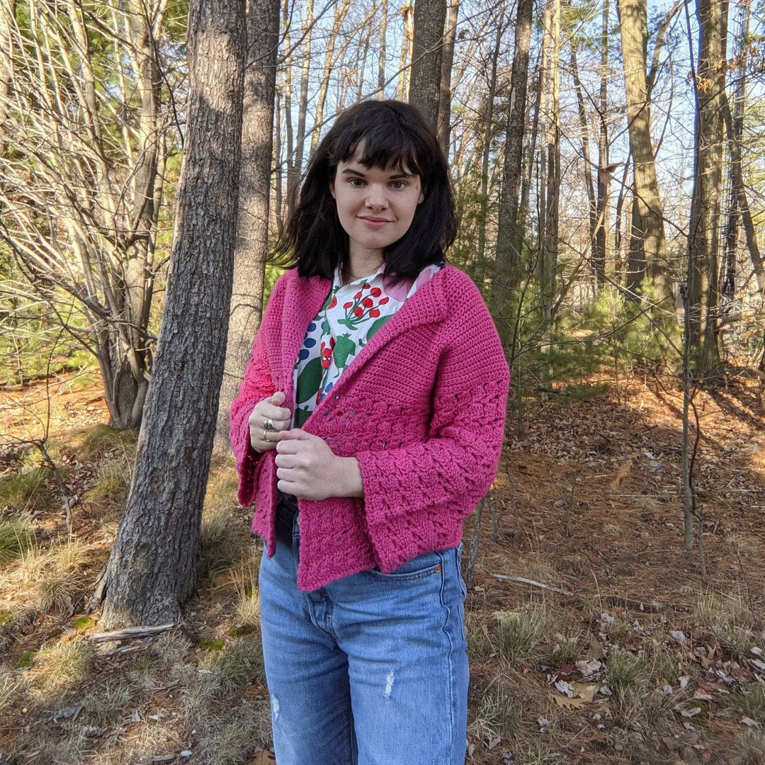 Love crochet, dislike seaming? This easy cardigan pattern is worked from the top down, using first single crochet and then finishing with the decorative cabbage patch stitch. It can be easily customized for length by adding or subtracting rows in the body or sleeves. The end result is a fun, comfy, easy cardigan with some decorative texture!  This pattern features Malabrigo Worsted yarn in Strawberry Fields.
