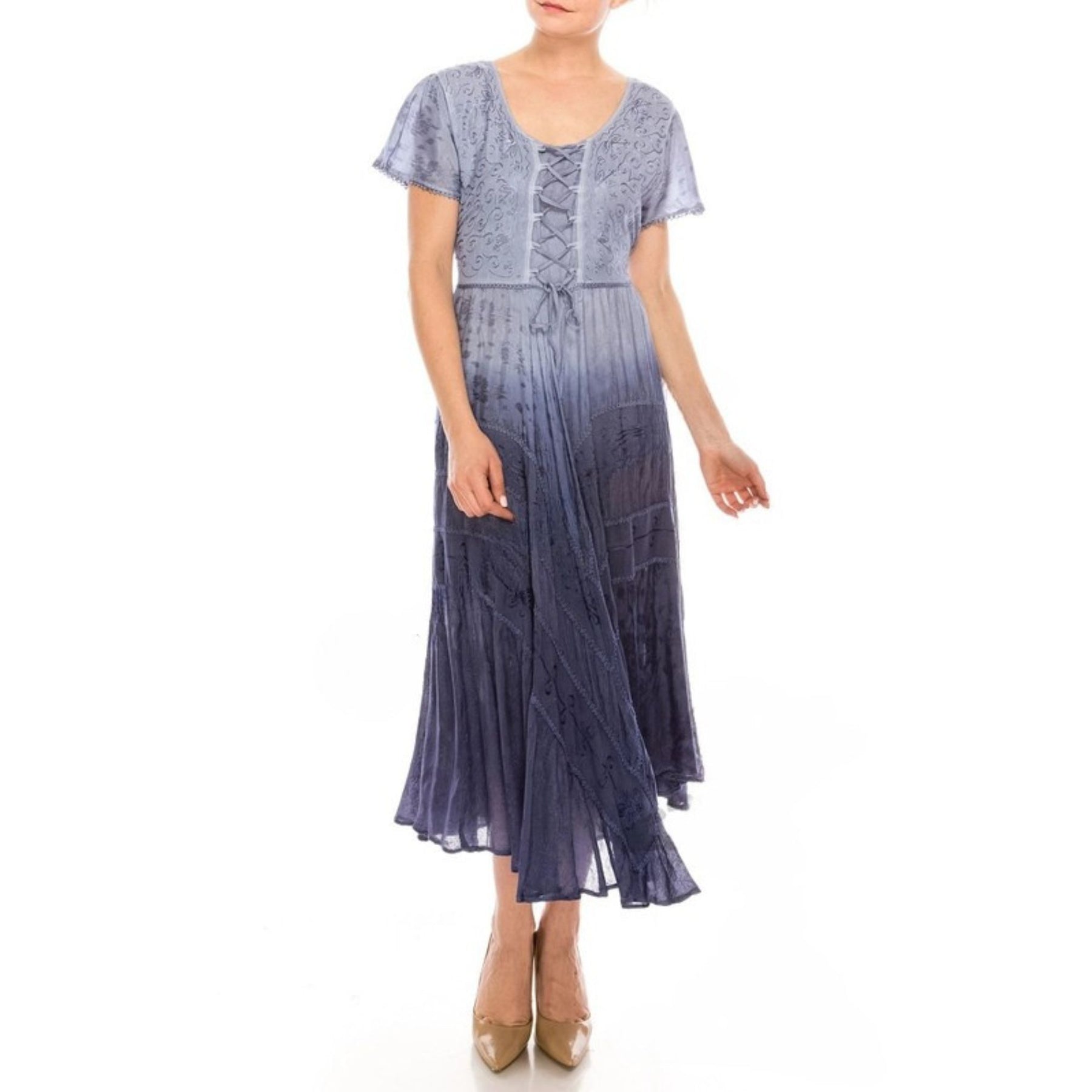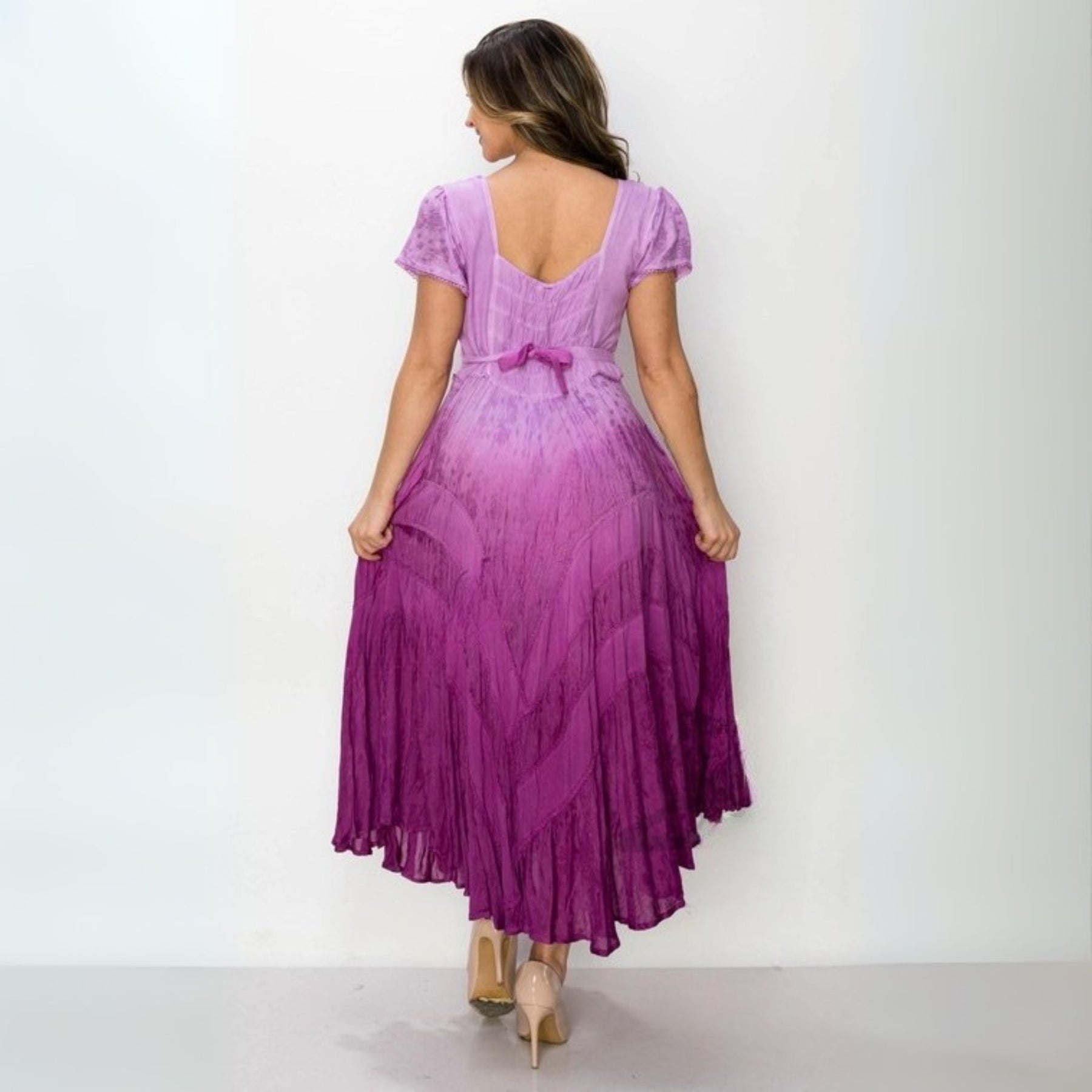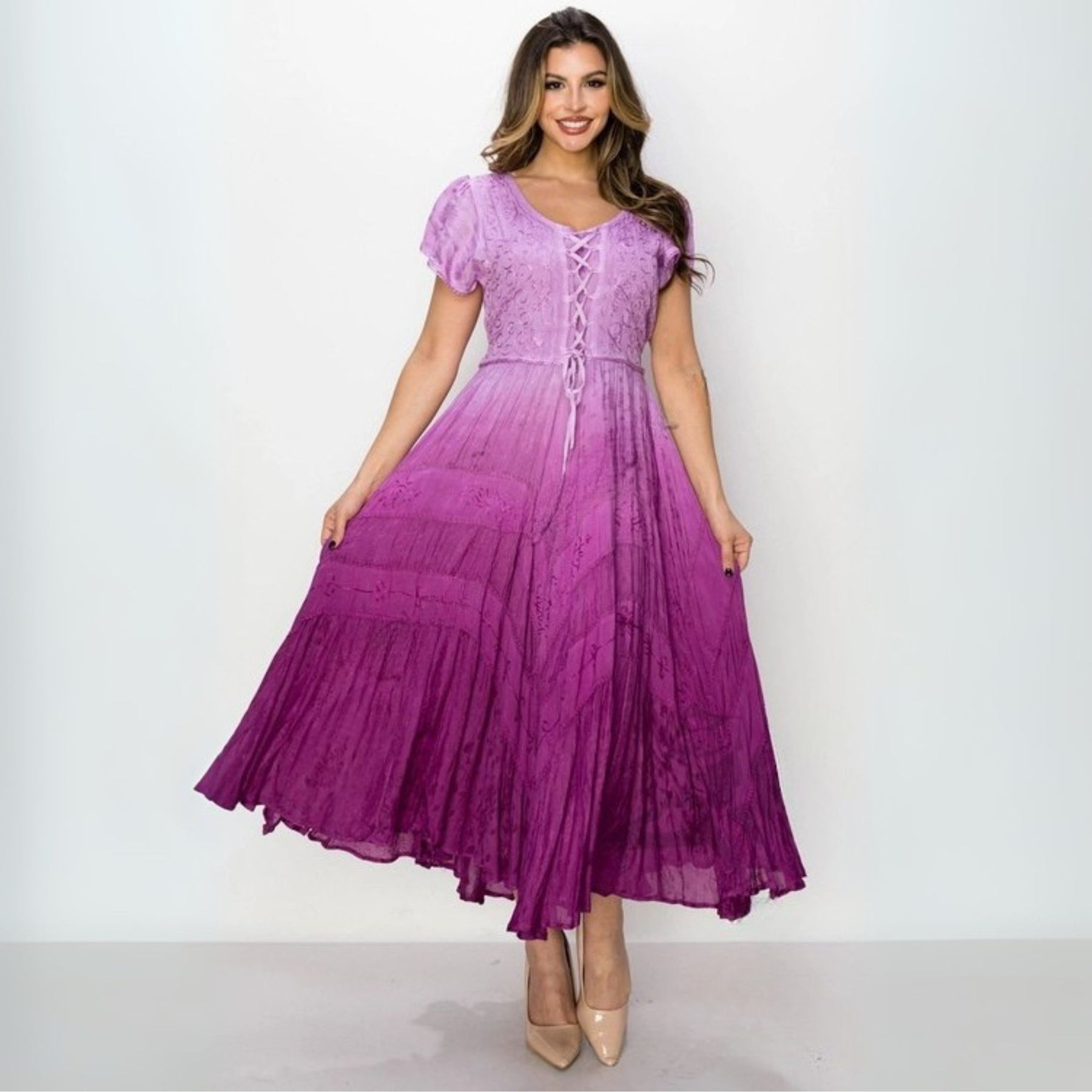 Embrace effortless bohemian elegance with this dreamy ombre dress, blending soft lavender hues into a rich, romantic gradient. This tea-length, flowy silhouette is designed for both comfort and style, featuring short flutter cap sleeves and a scoop neckline with lace-up bodice detailing for a subtle, corset-inspired touch.