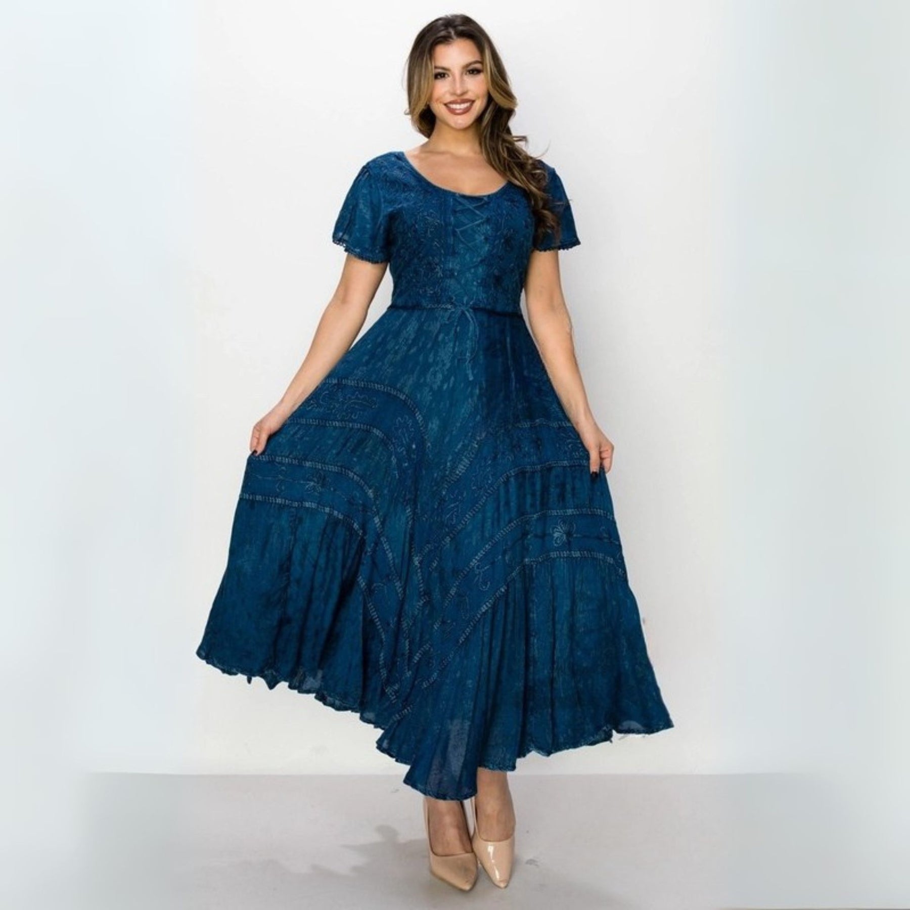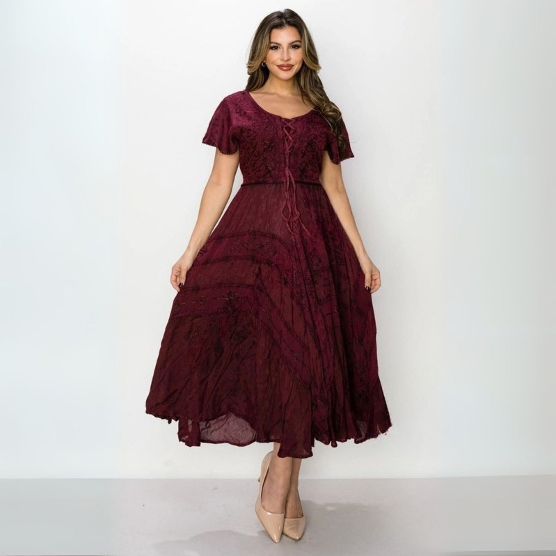 Crafted from lightweight, breathable rayon, the dress showcases a delicate textured pattern accented with floral embroidery and decorative stitching for an artisanal, handcrafted feel. The tiered skirt, adorned with intricate detailing, moves gracefully with every step, creating a flattering and feminine shape.