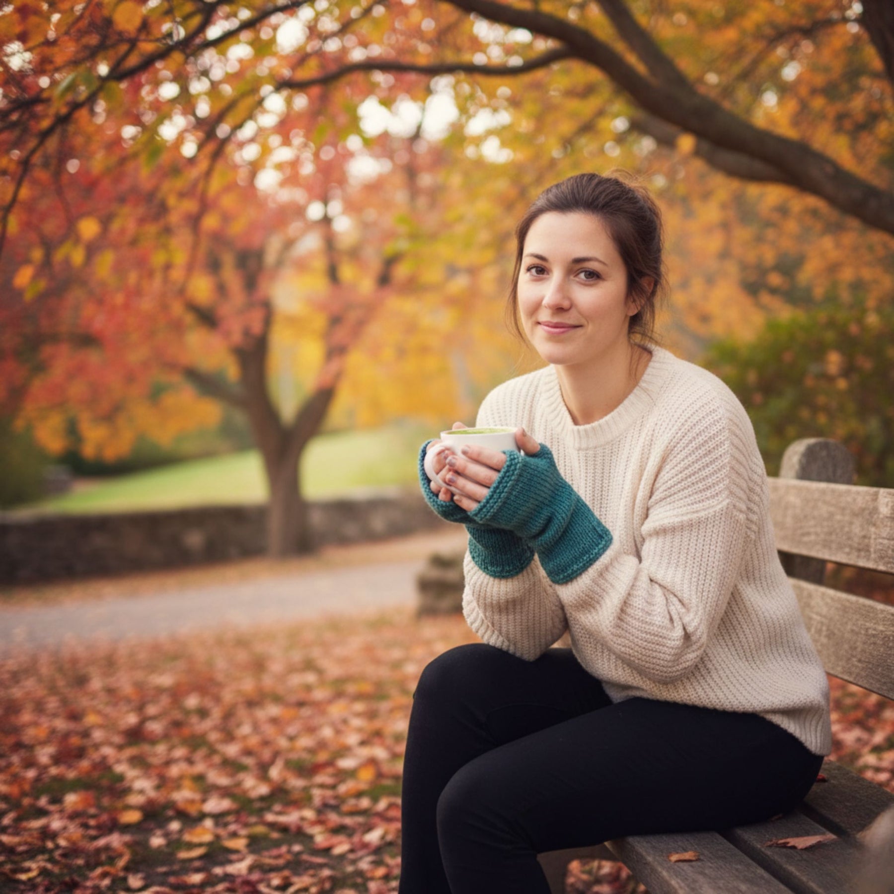 Model wearing blue Cestari Fingerless Knit Mittens and holding a green and white coffee cup