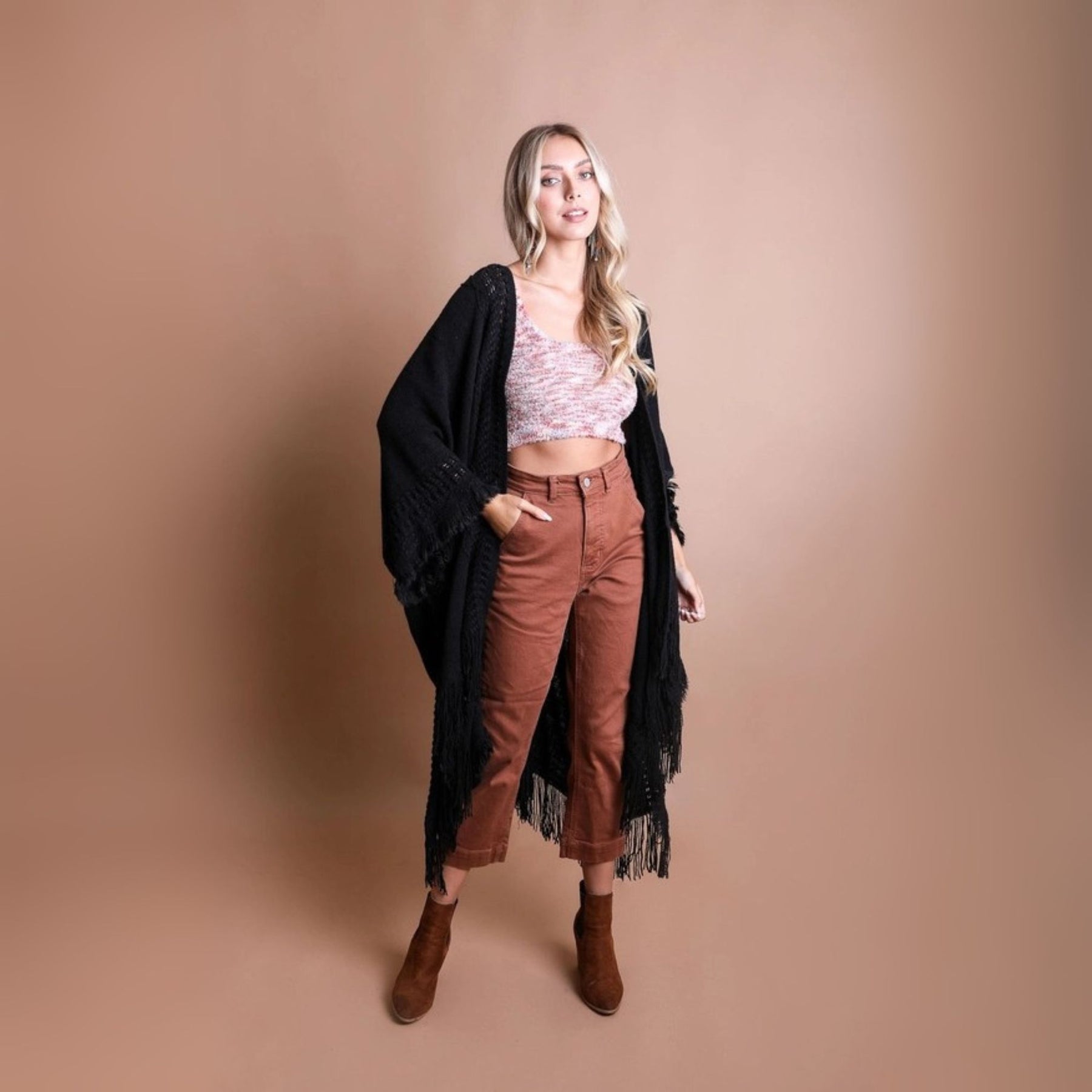 Introducing your new go-to for a blend of comfort and bohemian sophistication 🌿. Made from soft, breathable fabric, this ruana showcases intricate open work and frayed borders that effortlessly elevate your style.