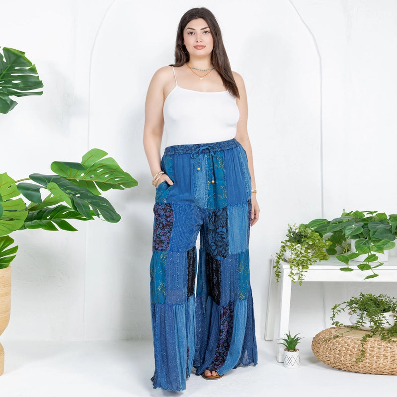 Step back in time with our Retro Revival Long Flared Patchwork Pants—a bold, bohemian statement piece inspired by the free-spirited style of the swinging sixties. Crafted from a rich blend of viscose, rayon, and luxurious georgette, these pants feature an artful mix of recycled patchwork fabrics in vibrant basil and deep blue tones, each telling its own story.