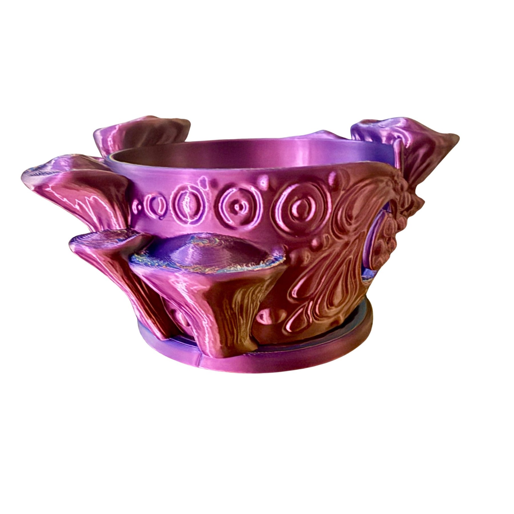 The Mystic Mushroom Yarn Bowl is 3D printed with a special iridescent filament that shifts between blue, purple, and light gold depending on the lighting and viewing angle. There are no batteries or LEDs—just pure color-shifting magic built into the material.